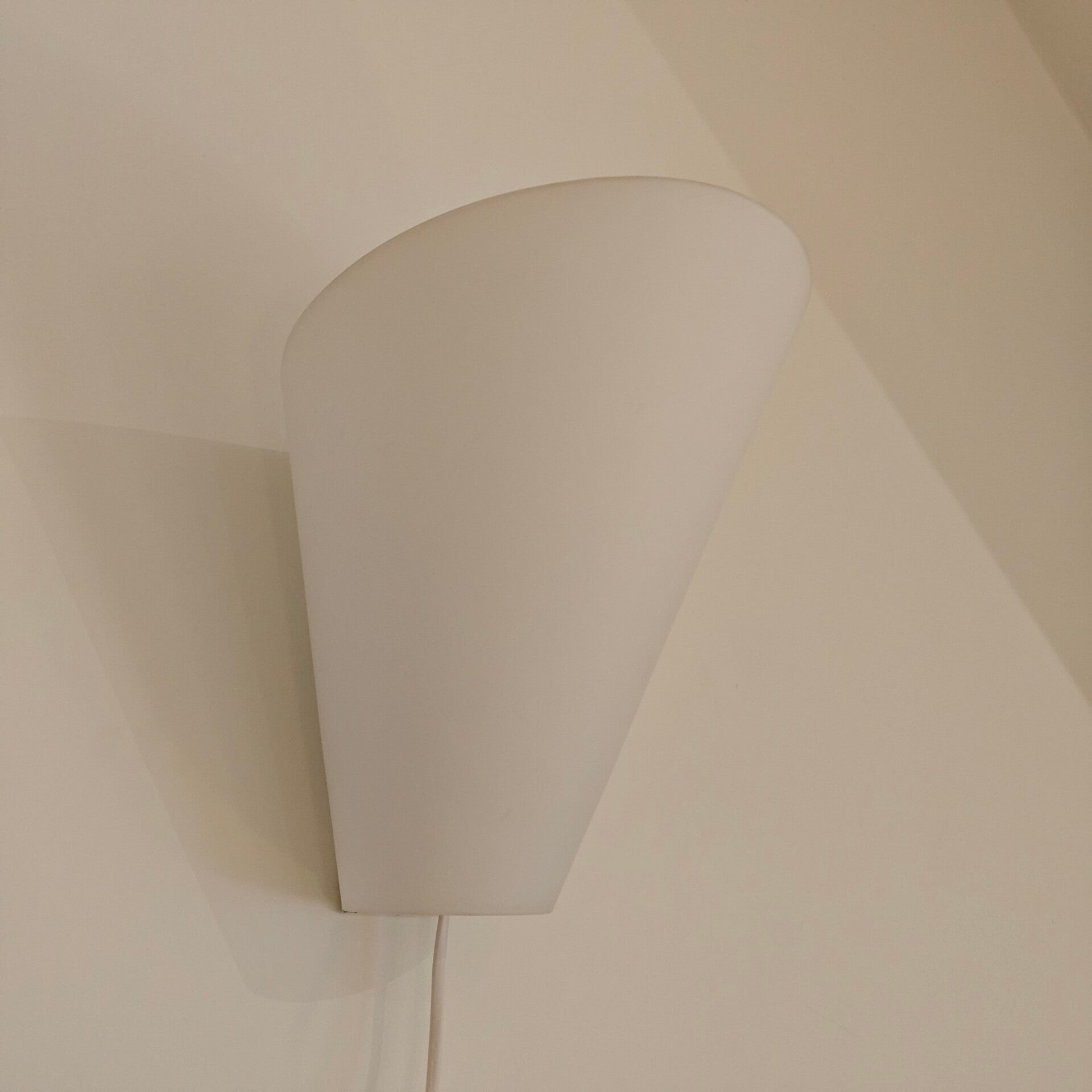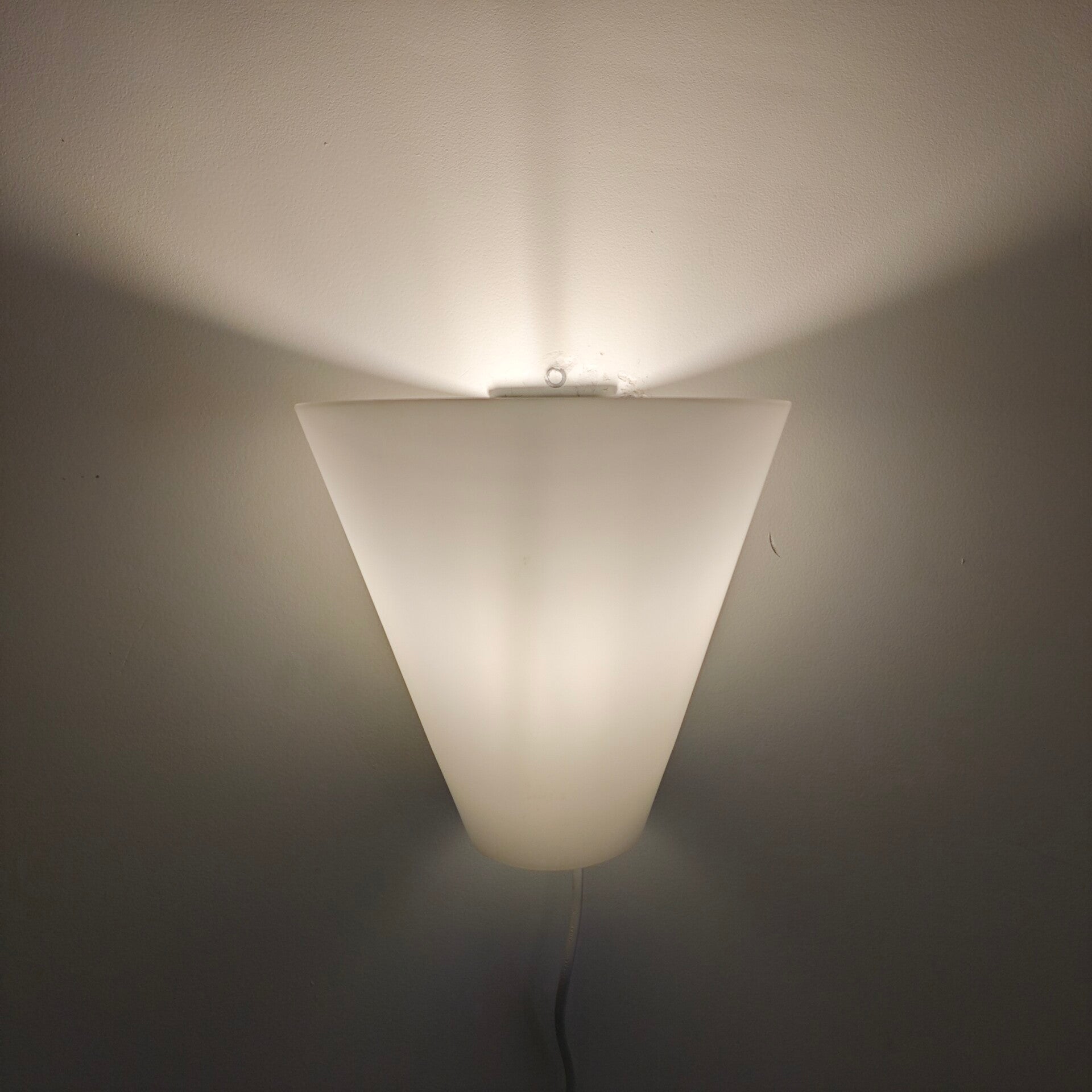 Deze prachtige glazen wandlamp is nog in zeer goede vintage staat. De glazen kap heeft op de achterkant een chip zitten maar die zie je niet als de lamp aan de muur hangt. Verder werkt de lamp goed en geeft die prachtig licht wanneer die aan staat. De lamp kan eventueel ook op zijn kop gehangen worden.