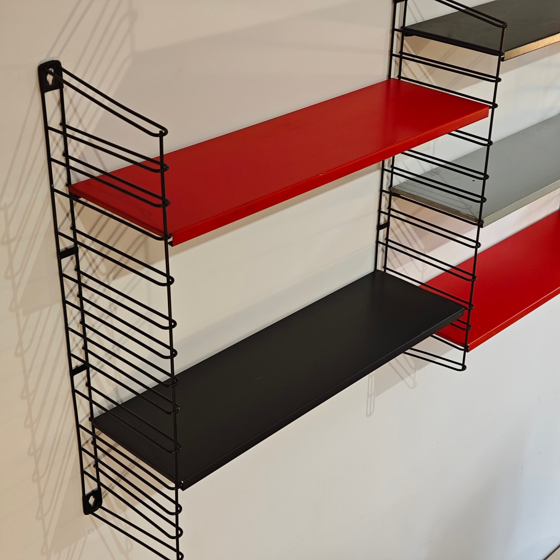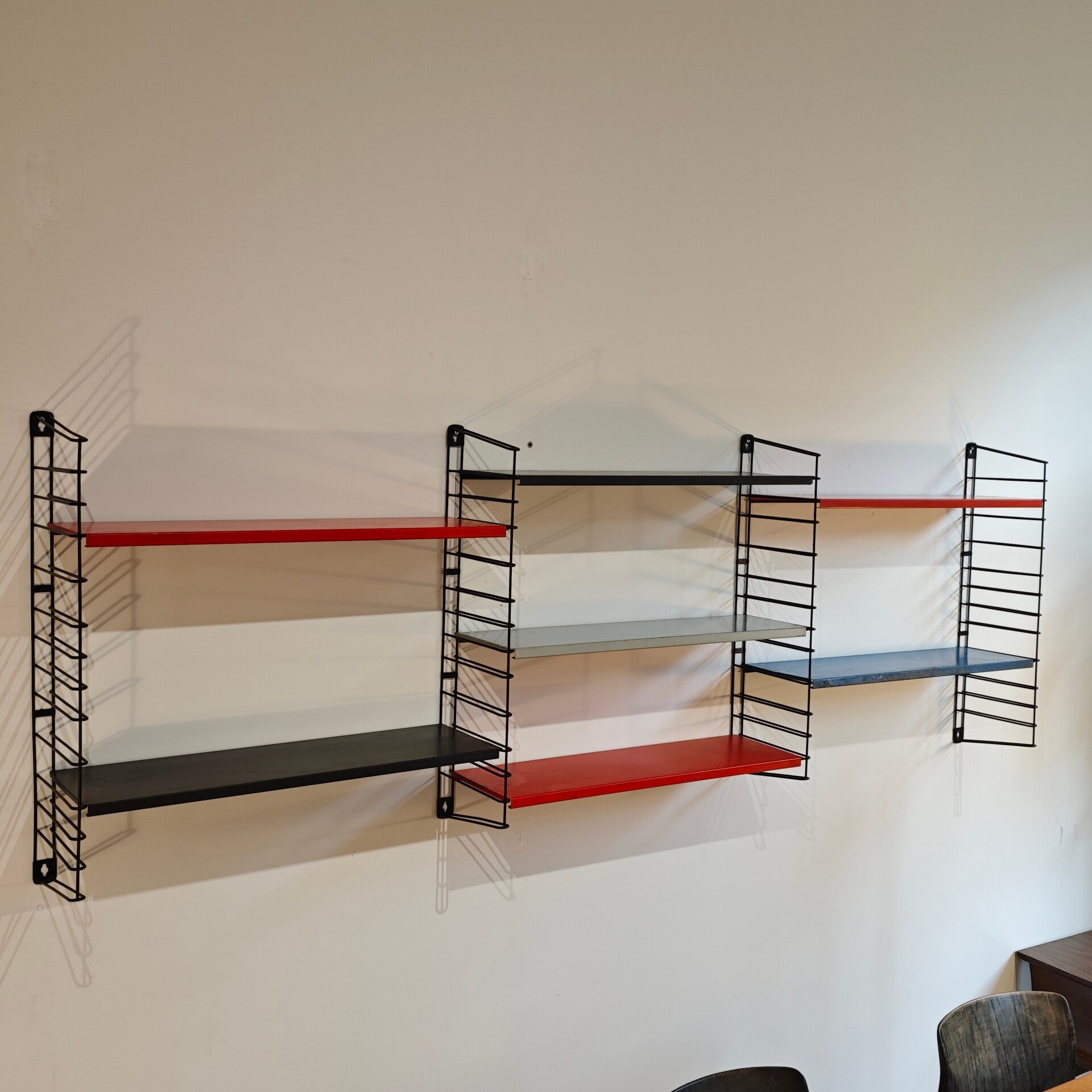 Dit leuke wandrek is nog in goede vintage staat. Sommige planken hebben wat roest en krassen maar zijn verder nog goed te gebruiken. De ophang steunen zien er nog netjes uit. Een zeer praktische en stijlvol wandrek!