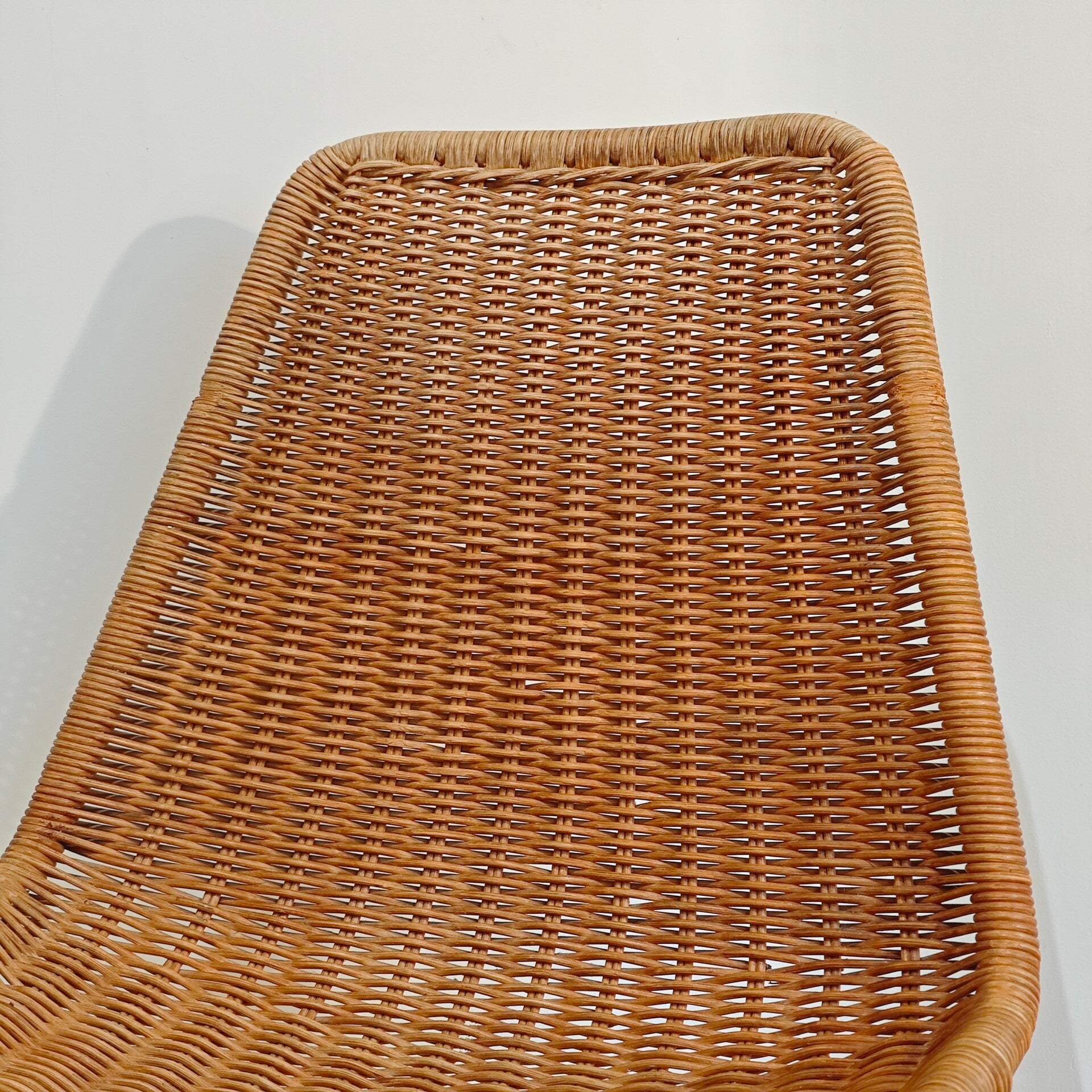Deze stijlvolle eetkamer stoel is nog in goede vintage staat. Het chroom onderstel had veel roest plekken. Die heb ik opgepoetst waardoor die weer netjes glimt. Hier en daar zijn nog wel wat plekjes te zien. Het riet heeft ook kleine gebruikssporen maar is voor zijn leeftijd nog erg netjes.