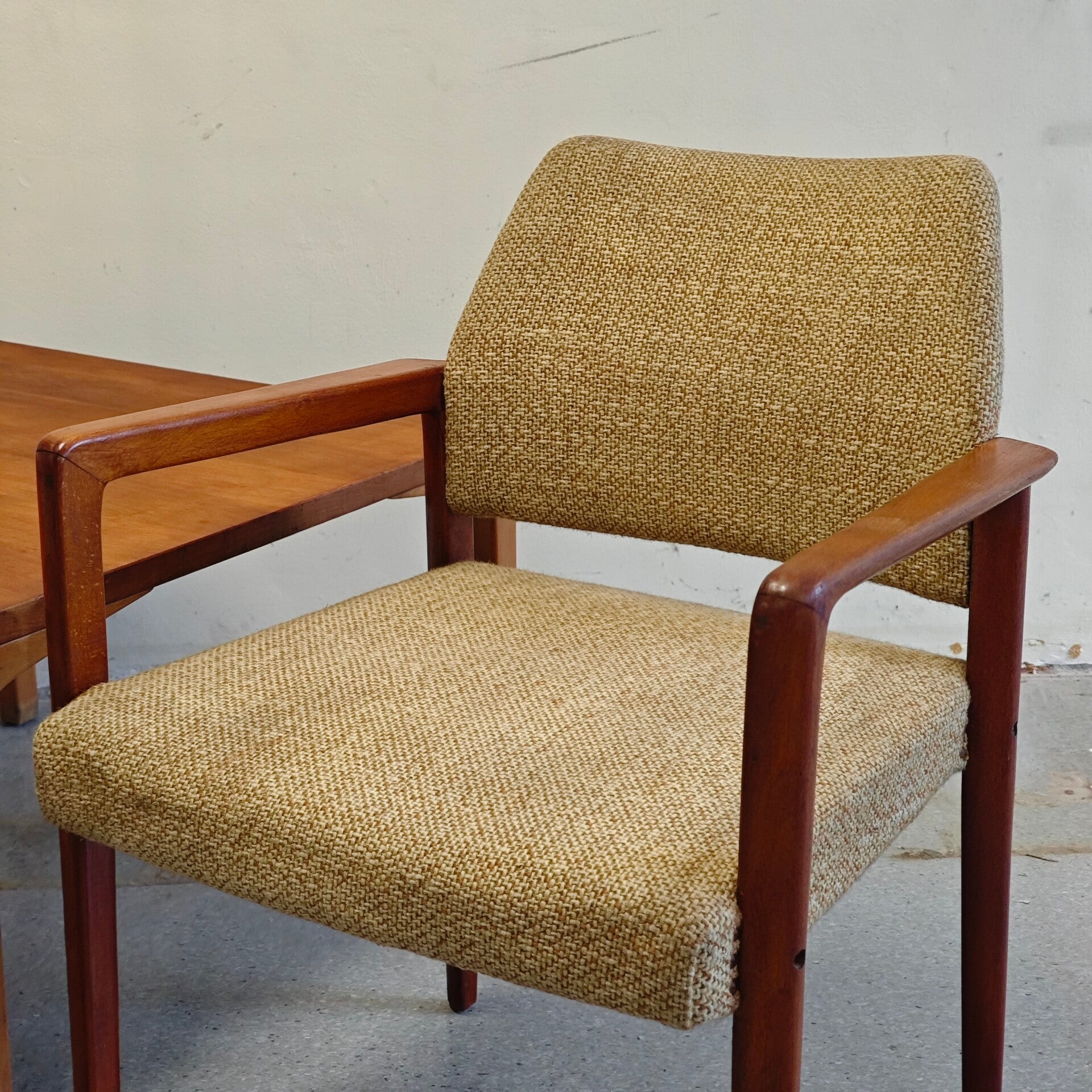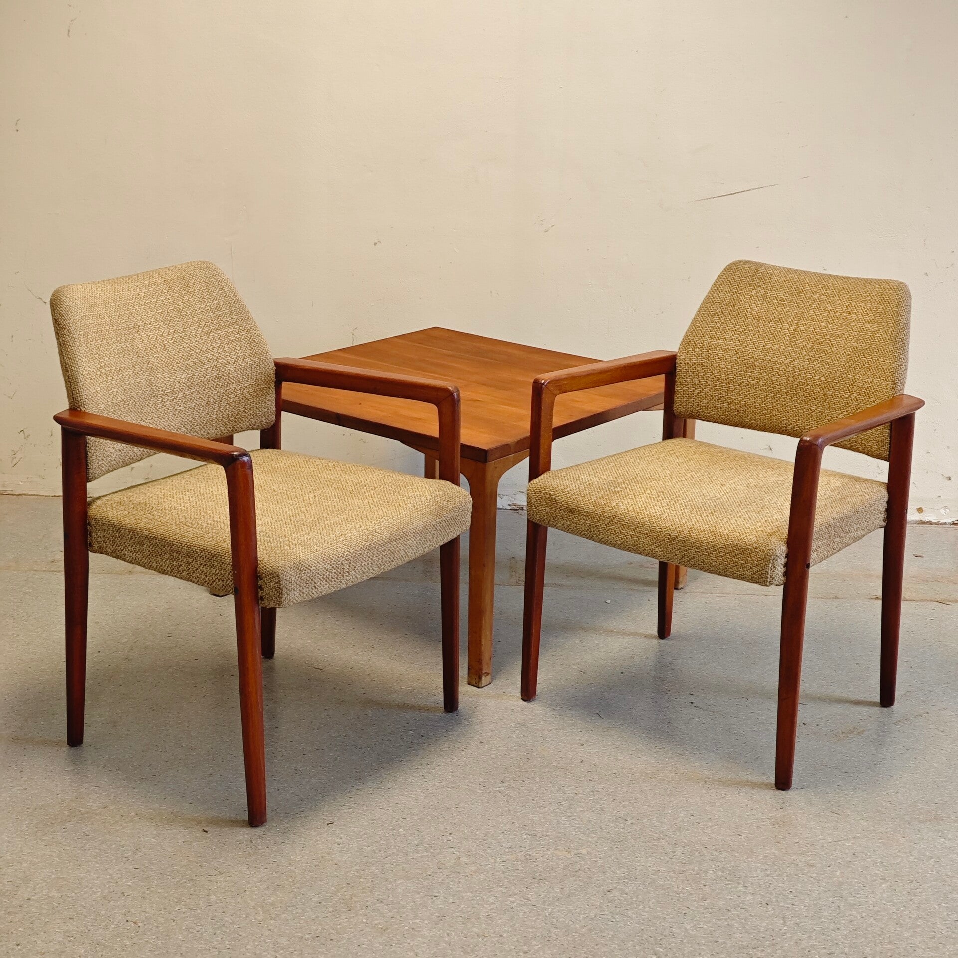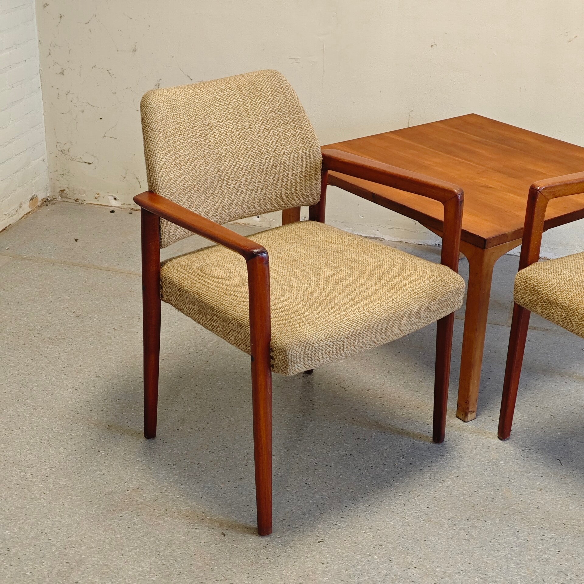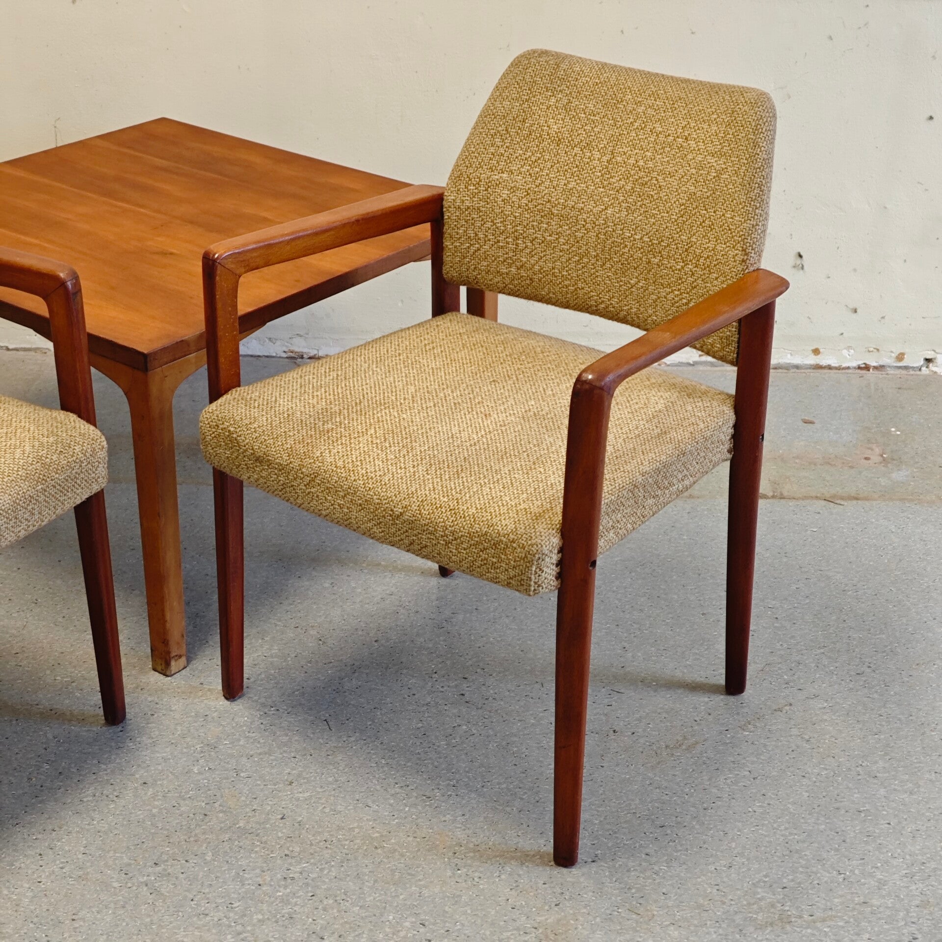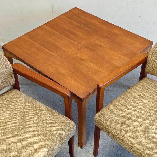 Vintage Deense fauteuils met salontafel uit de jaren 60. De stoelen zijn 82 cm hoog en het zitvlak is op 46 cm. De stoelen zijn 60 cm breed en diep. De tafel is 78 x 78 cm en 50 cm hoog.
