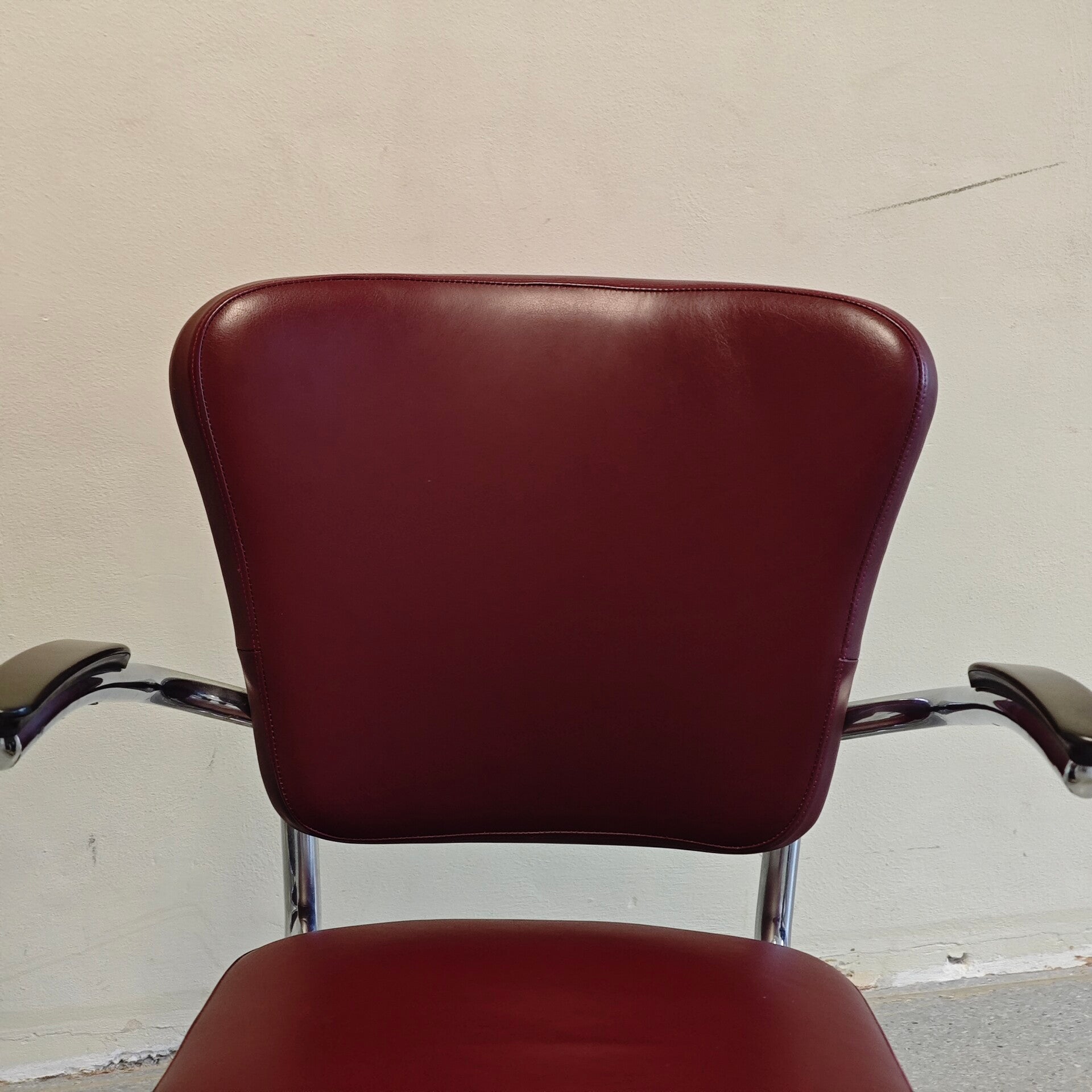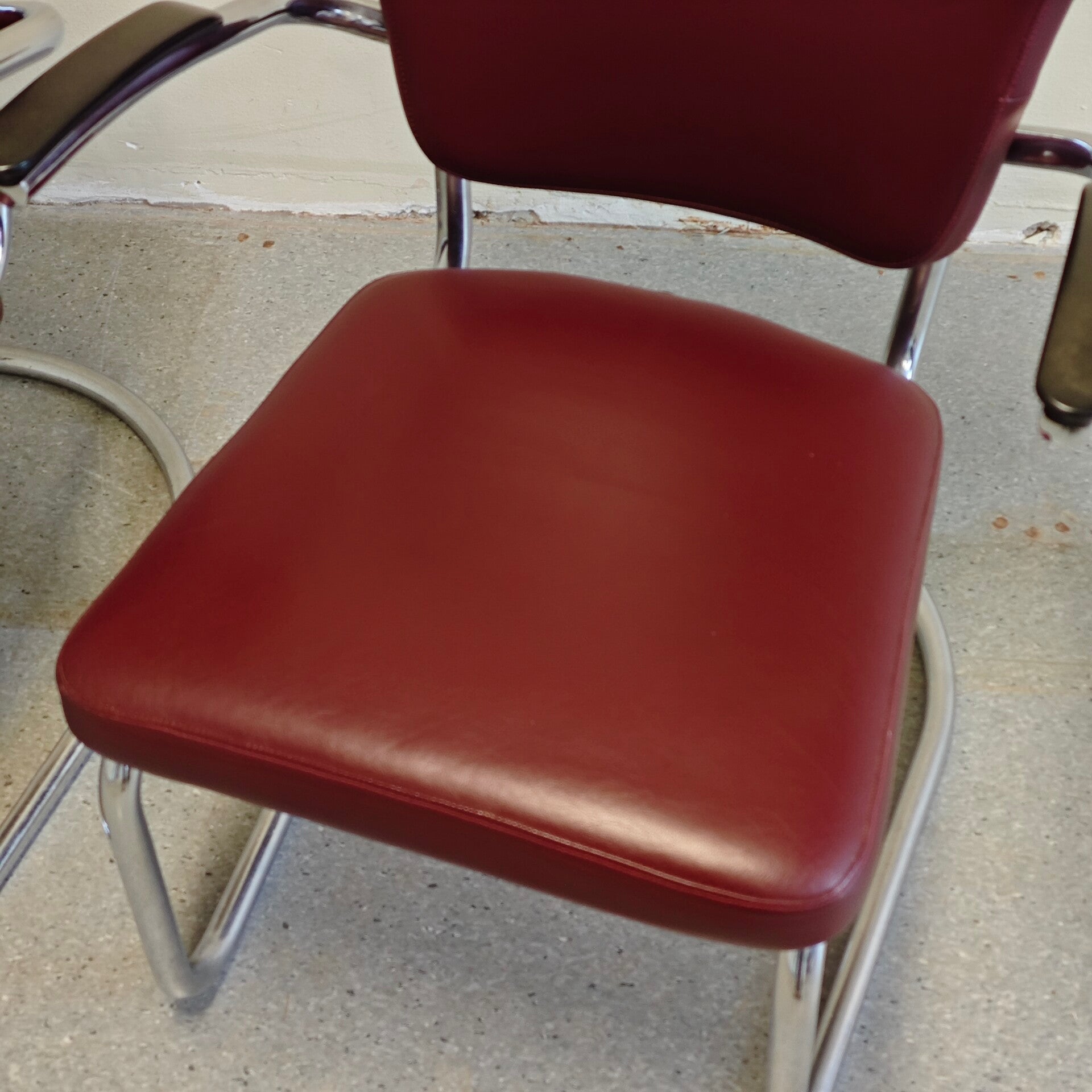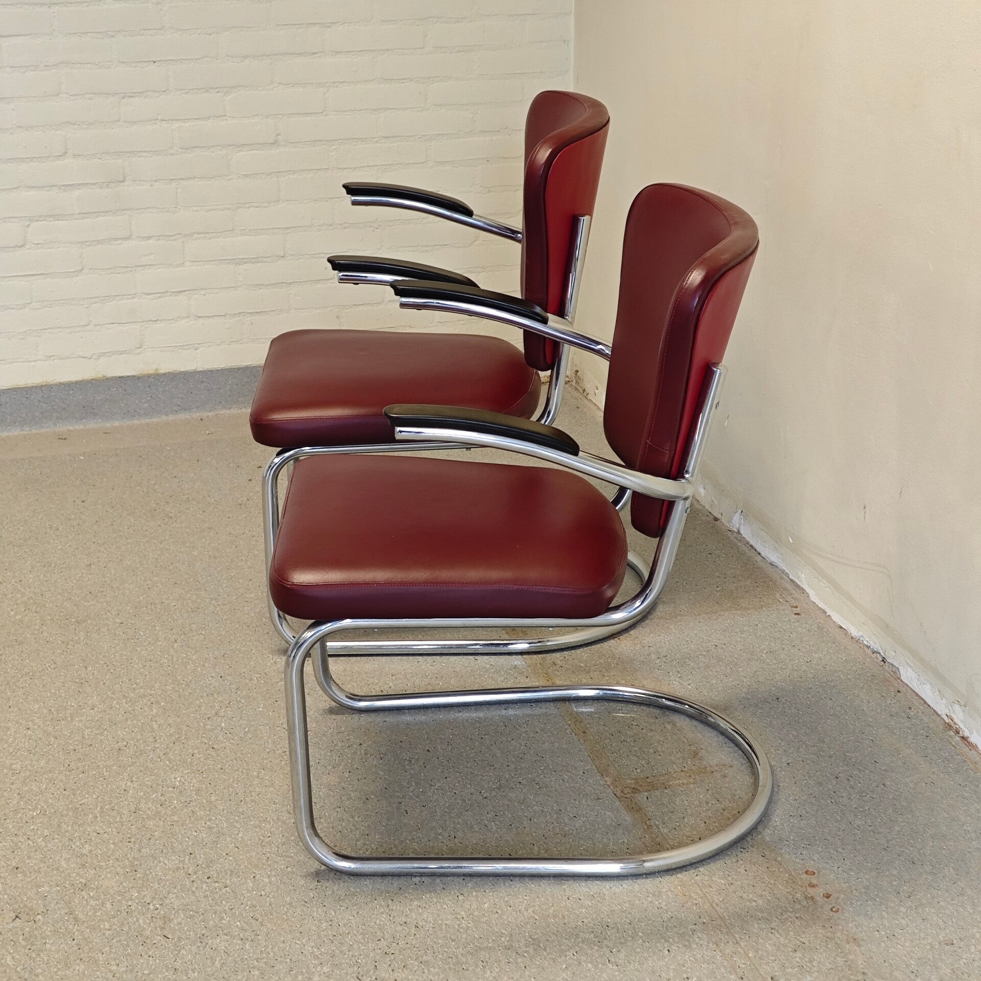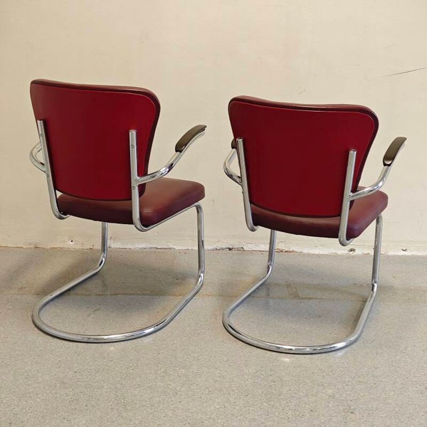 Deze fantastische stoelen zijn nog in zeer goede staat. Het rode leer is nog vrijwel perfect en heeft alleen hier en daar lichte gebruikssporen. De buisframes zien er nog netjes uit en hebben alleen hier en daar lichte plekjes. Een prachtige zeer degelijke set Fauteuils ontworpen door Paul Schuitema.