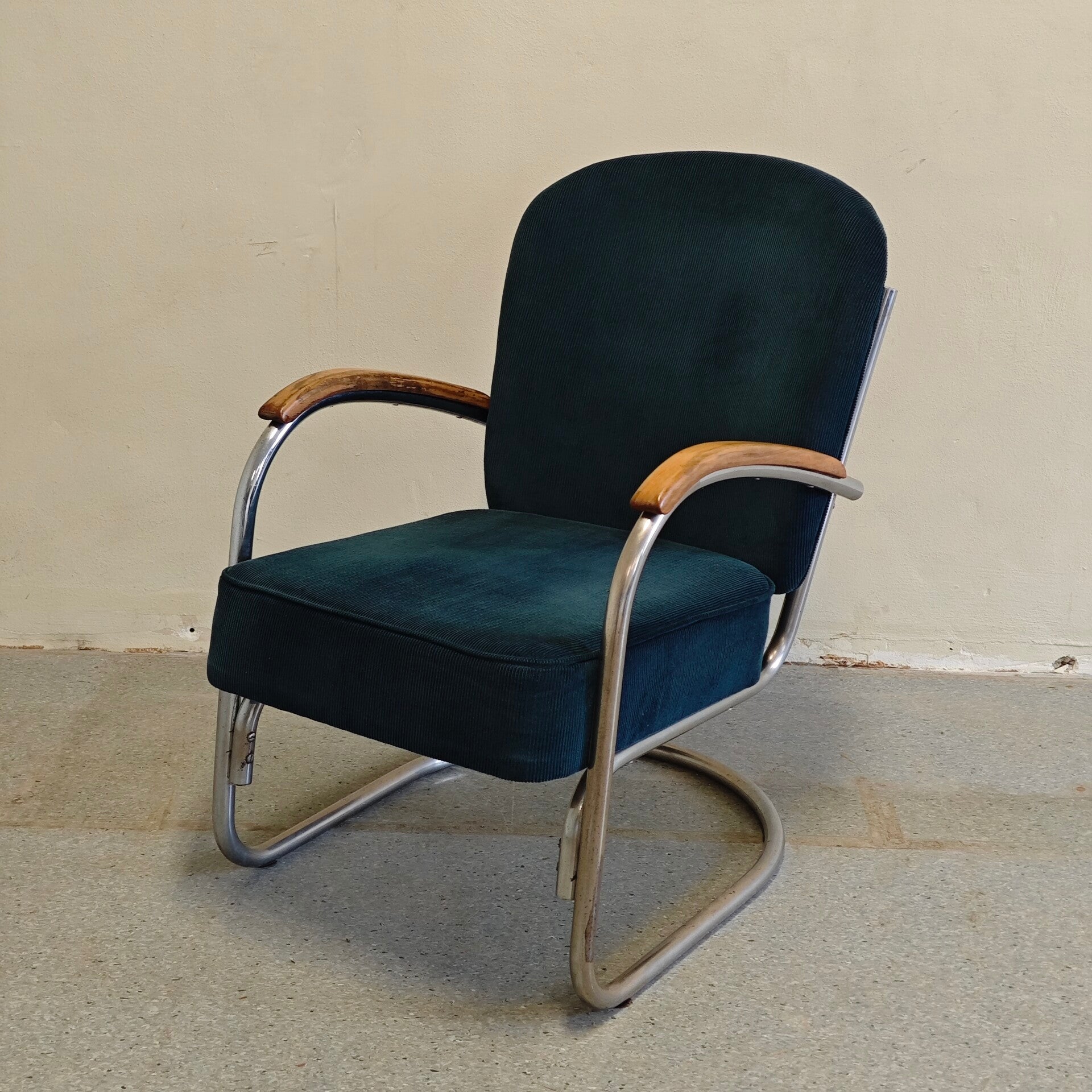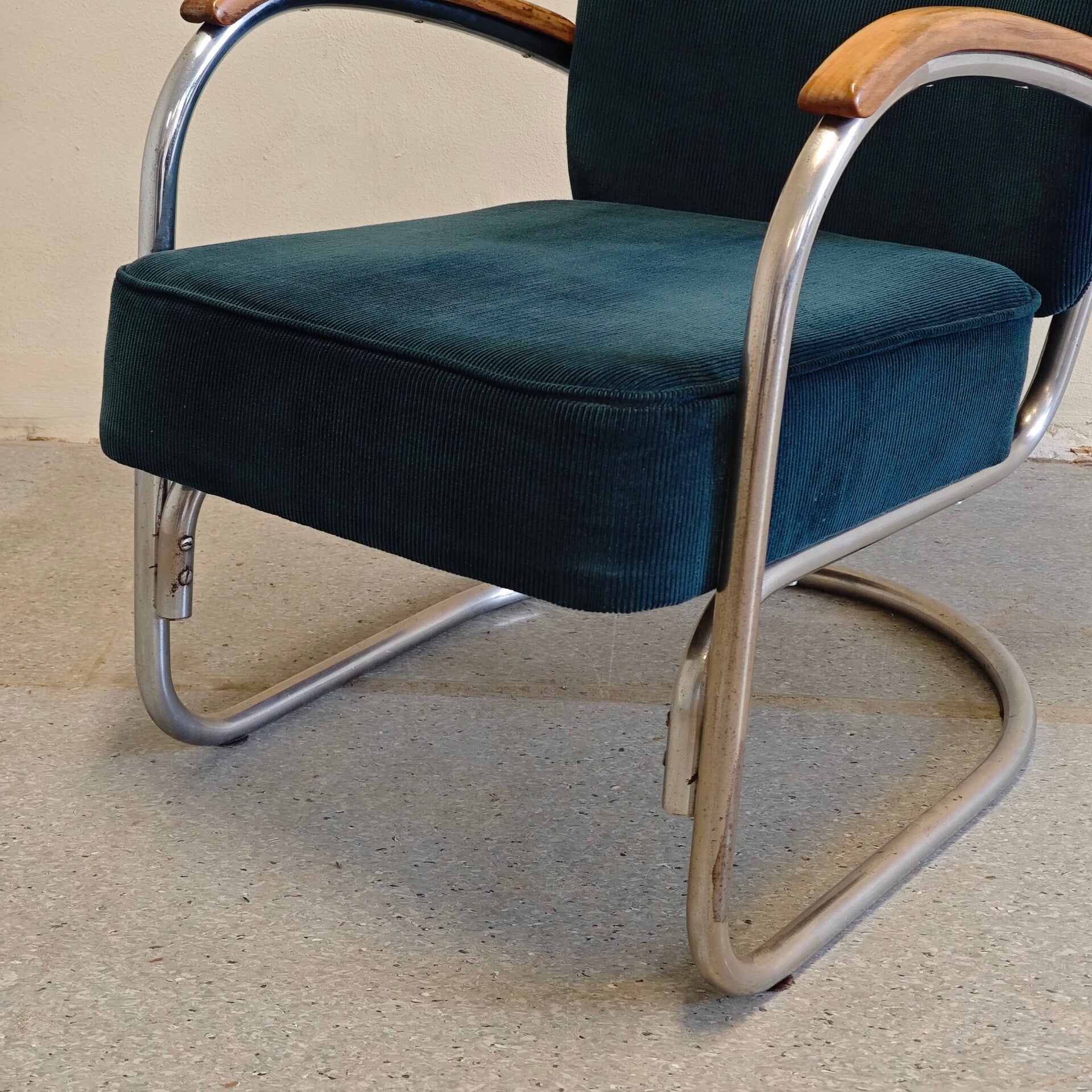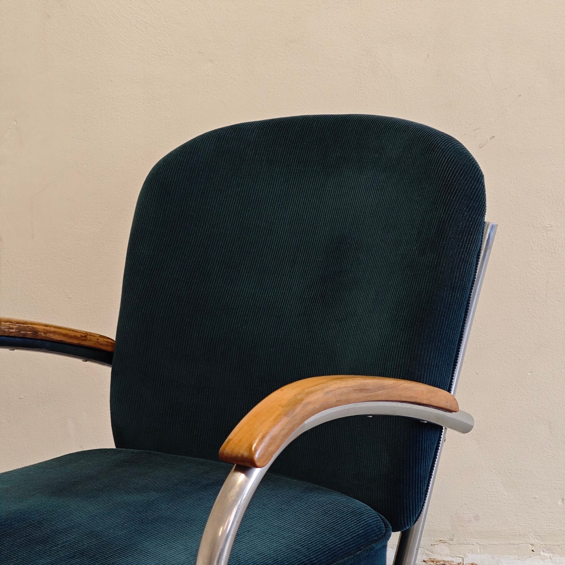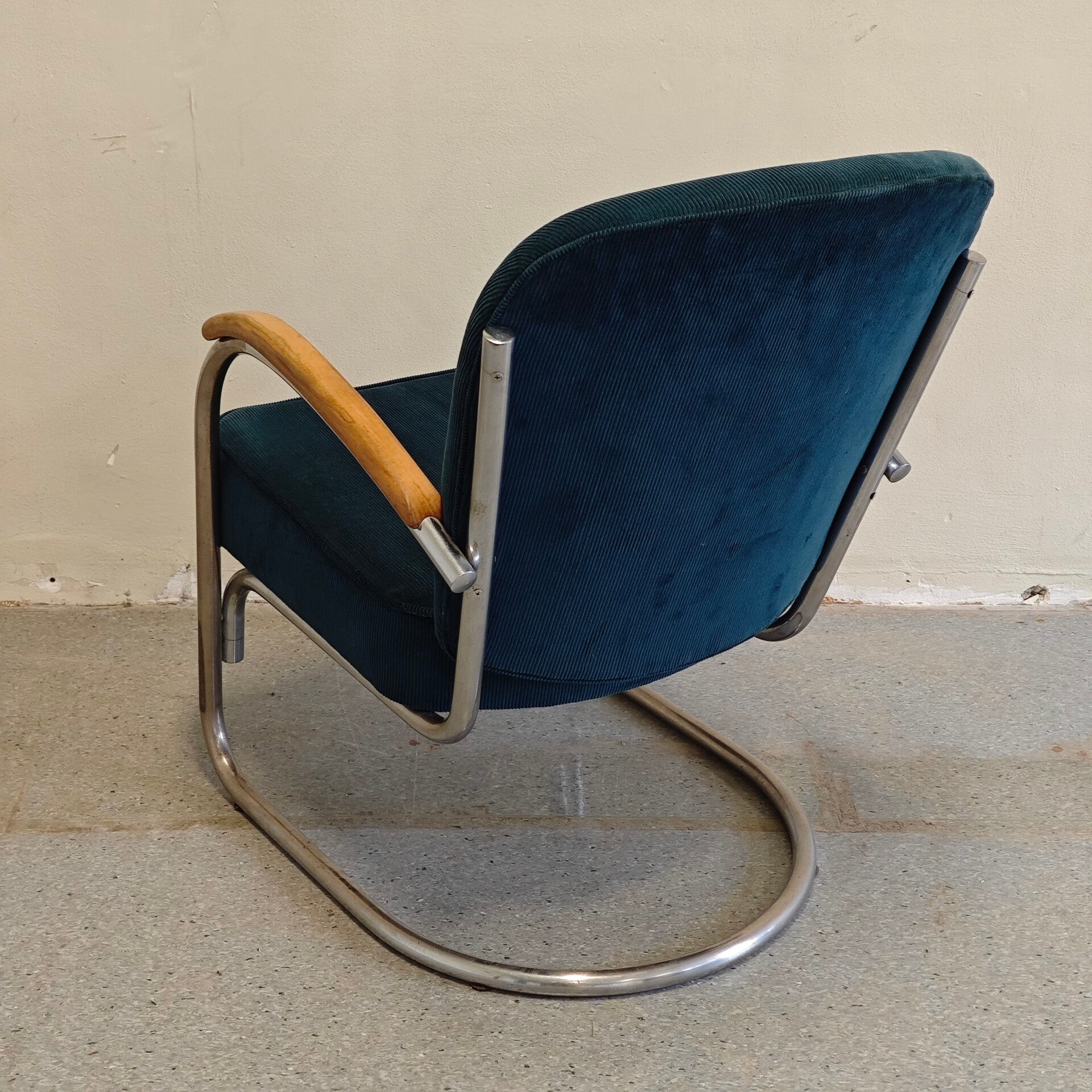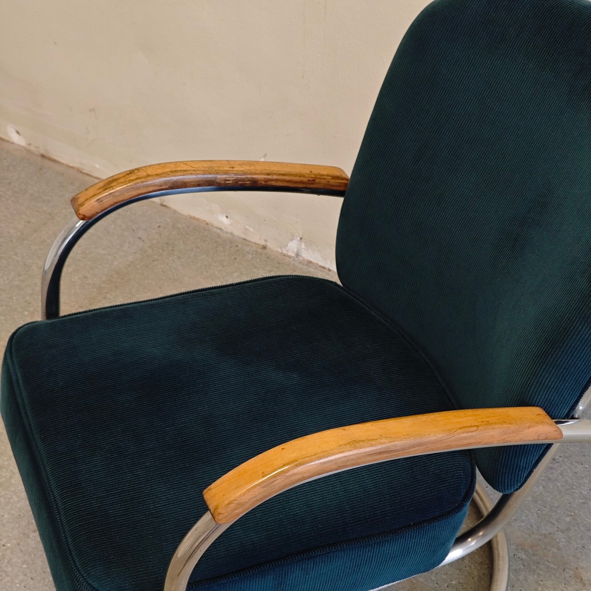 Deze prachtige stoel is nog in zeer goede vintage staat. De petroleum groene Manchester stof is nog al helemaal perfect en past prachtig bij deze stoel. Het buisframe heeft hier en daar wat gebruikssporen maar is verder nog erg netjes. Deze klassieker ziet nog heerlijk zal nog jaren mee gaan!