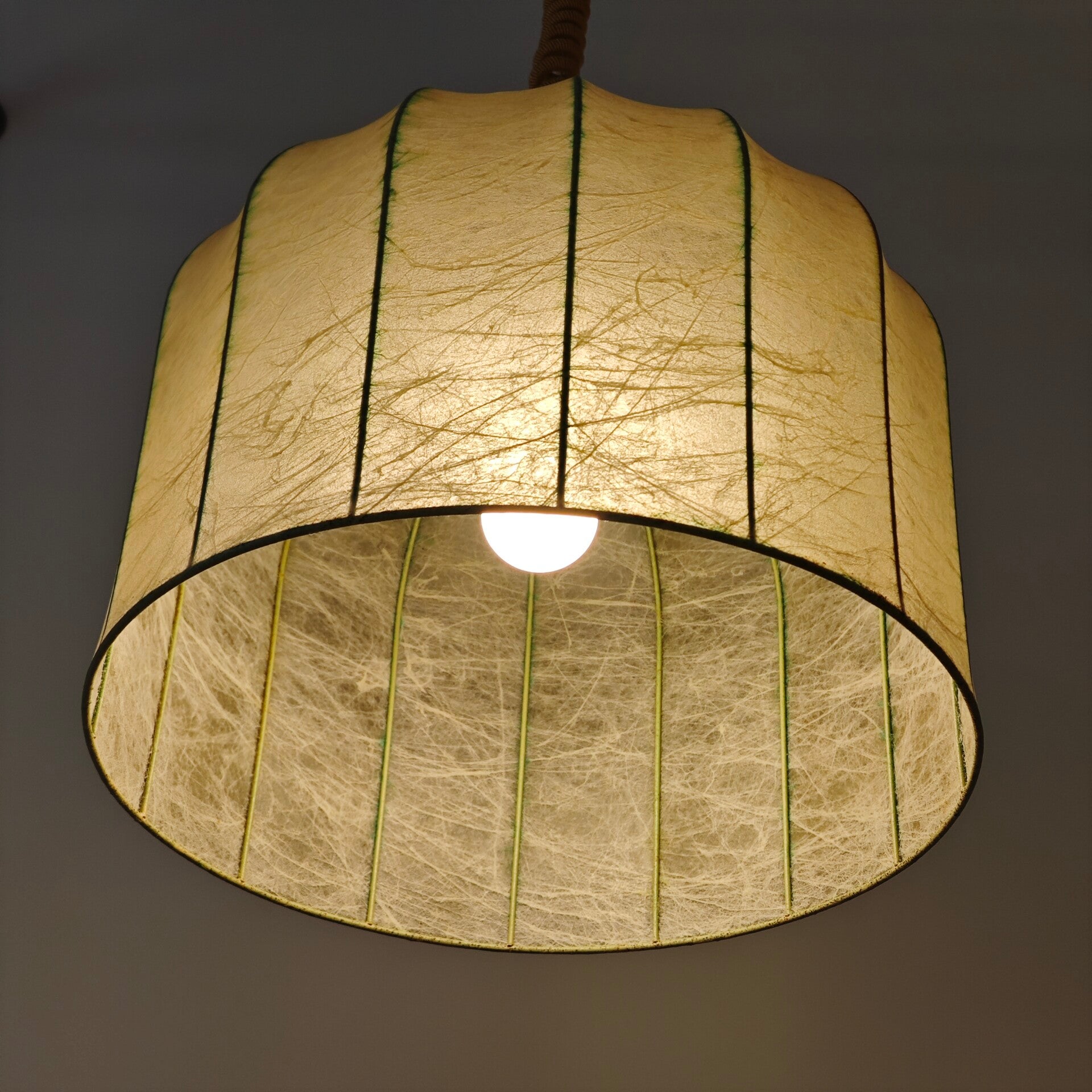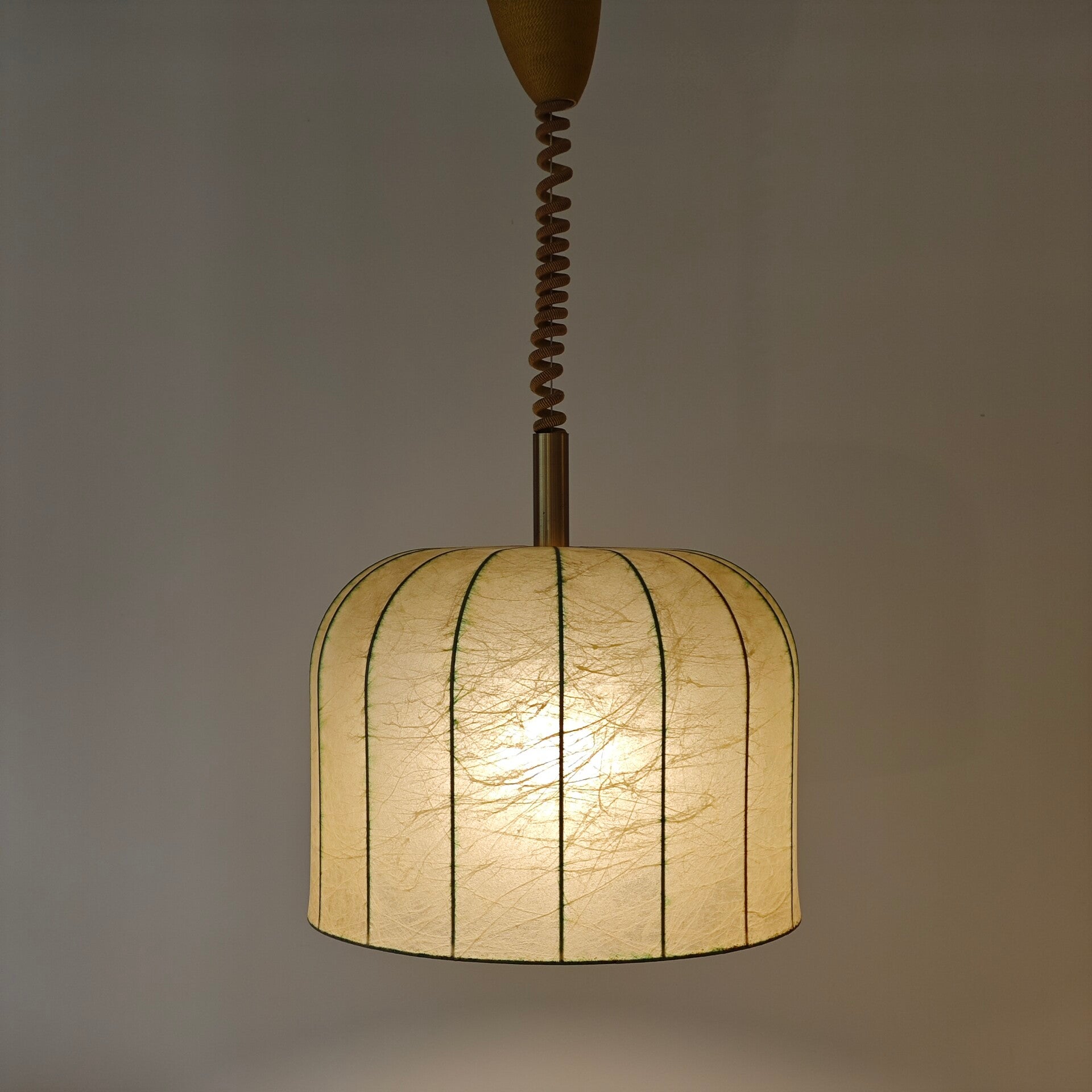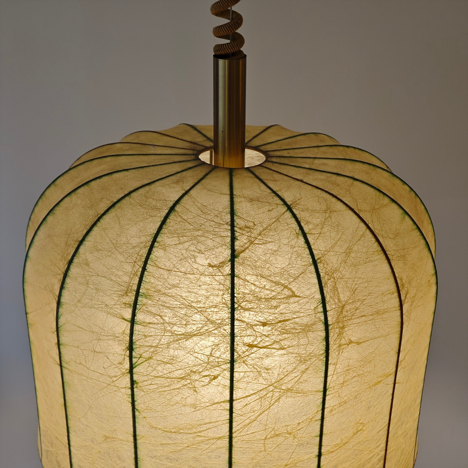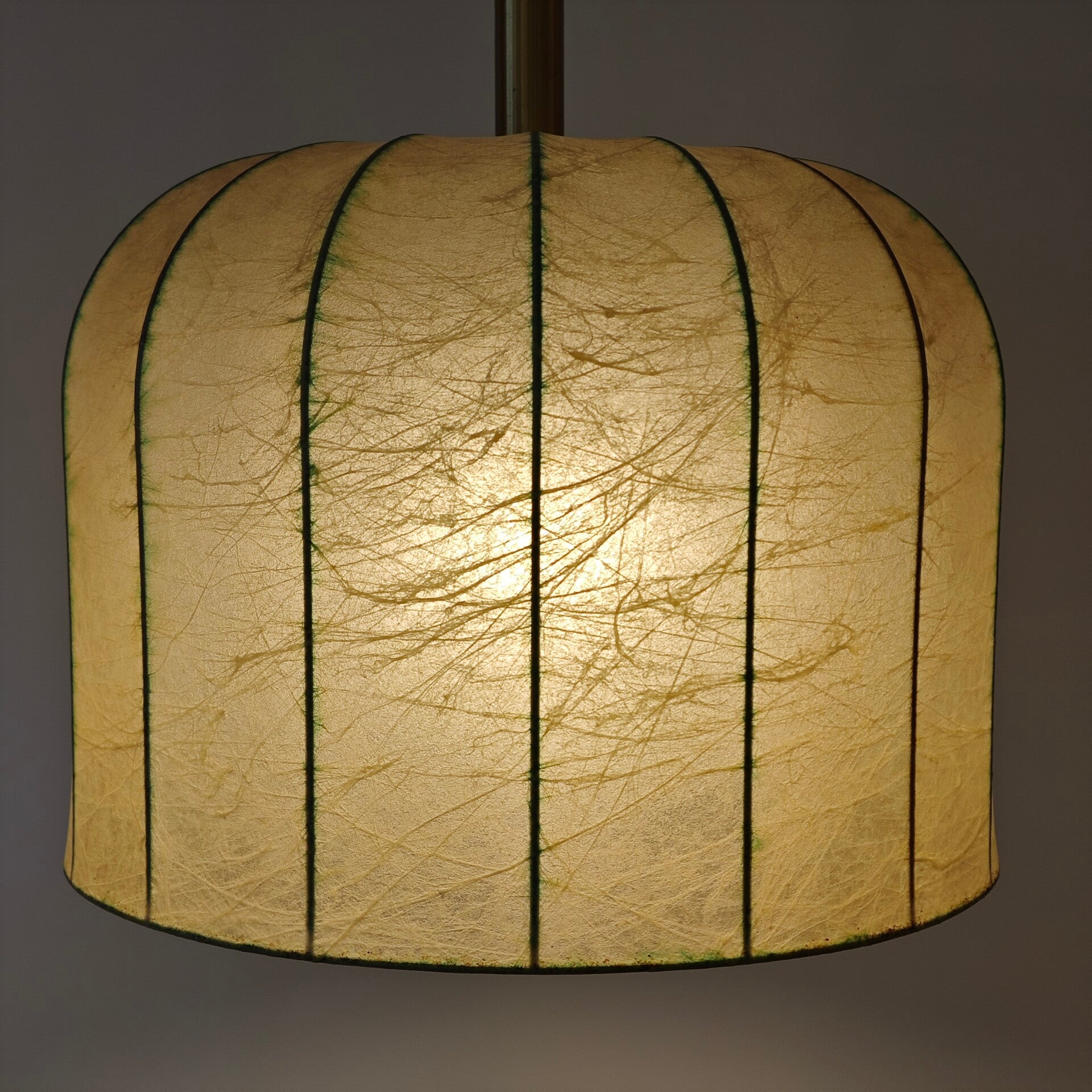 Deze prachtige hanglamp is nog in vrijwel perfecte staat. De kap is nog helemaal heel en geeft erg mooie licht wanneer die aan staat. Het ophangsysteem ziet er ook nog netjes uit en werkt makkelijk. Door het mooie patroon in dit kap is deze lamp een zeer uniek object!
