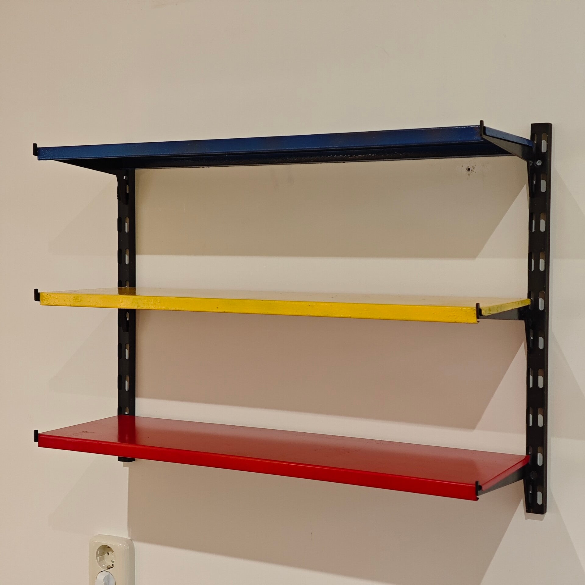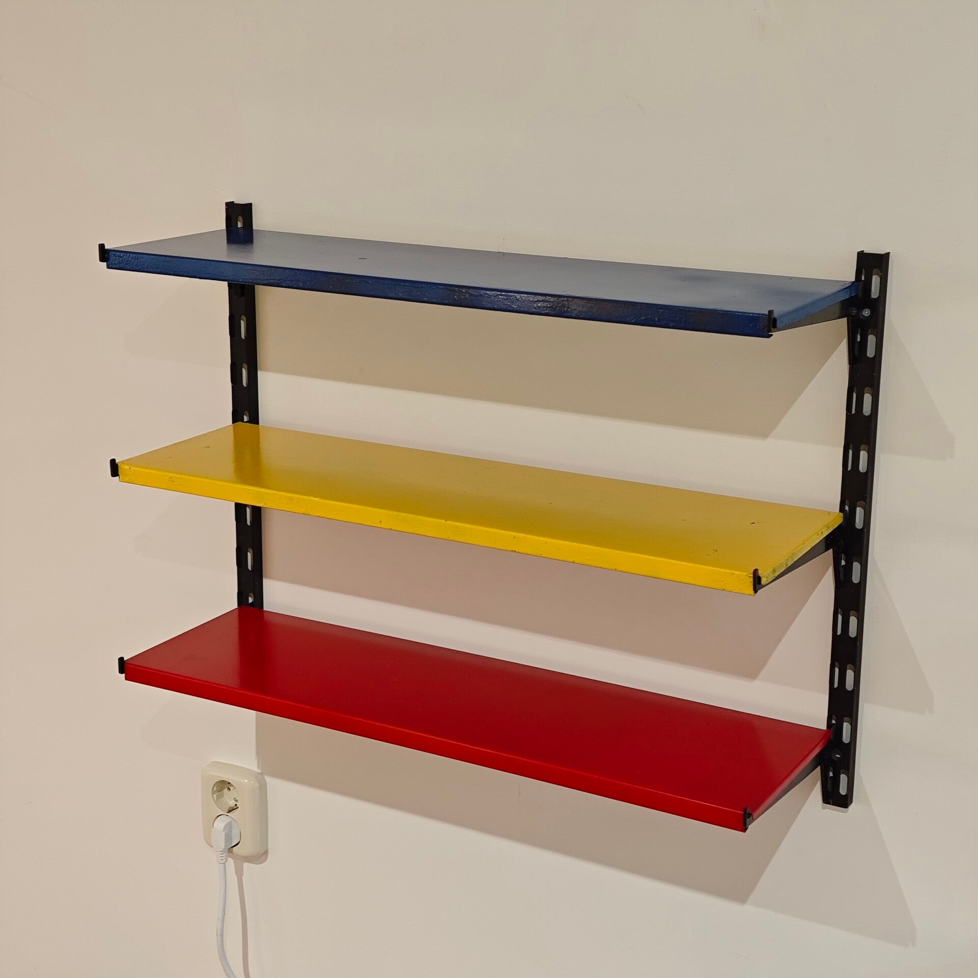 Dit leuke rekje is nog in goede vintage staat. De plankjes zijn overgespoten maar hebben wel nog wat gebruikssporen. Het is een makkelijk en leuk systeem waardoor je hem op verschillende hoogtes kan verstellen.