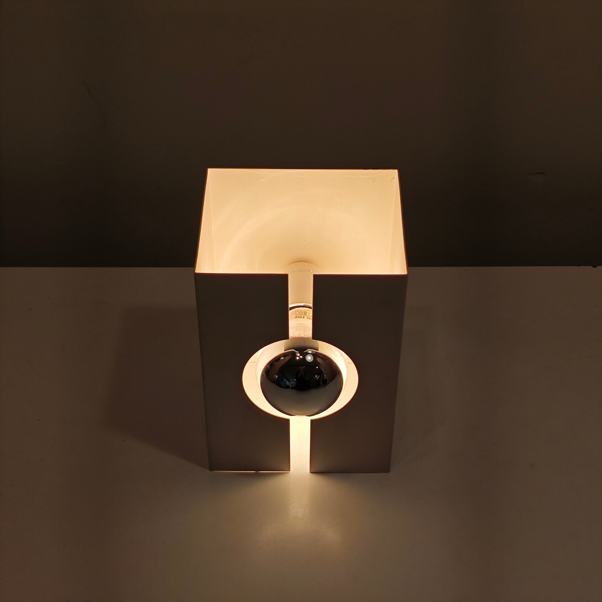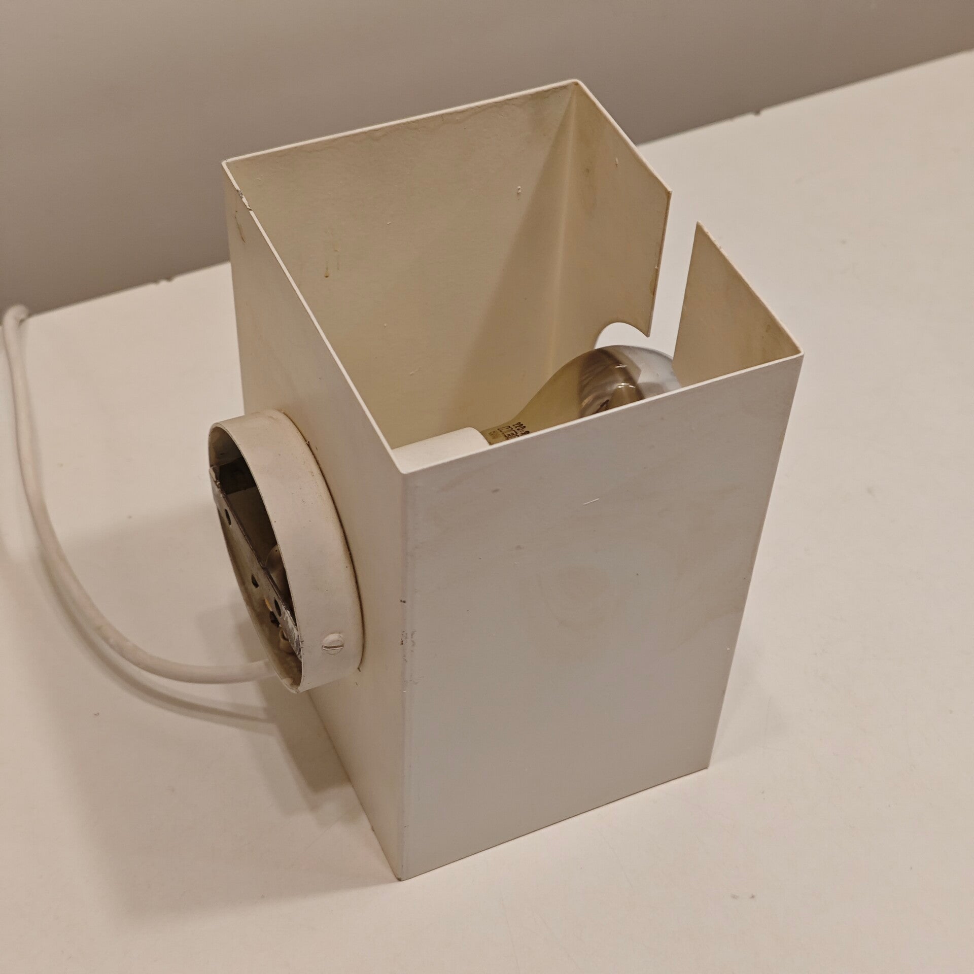 Vintage space age wandlamp uit de jaren 70. De lamp is 18 cm hoog en 12,5 cm breed en diep.