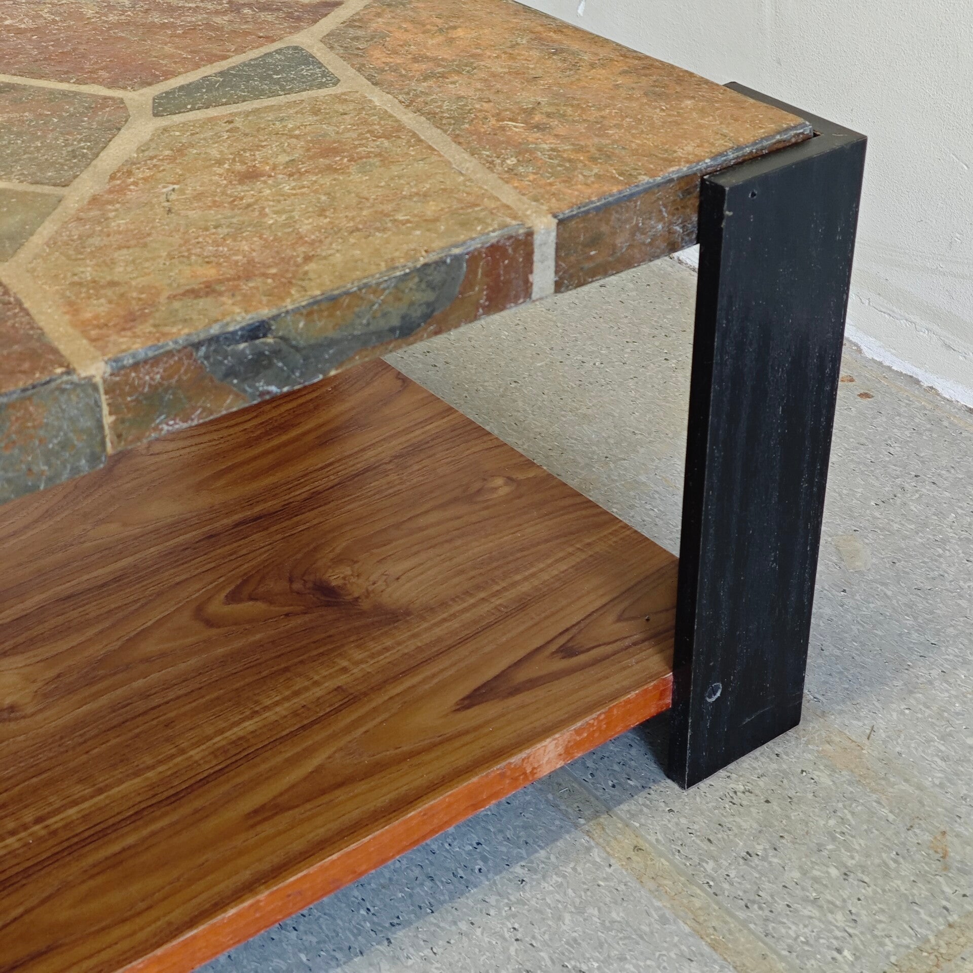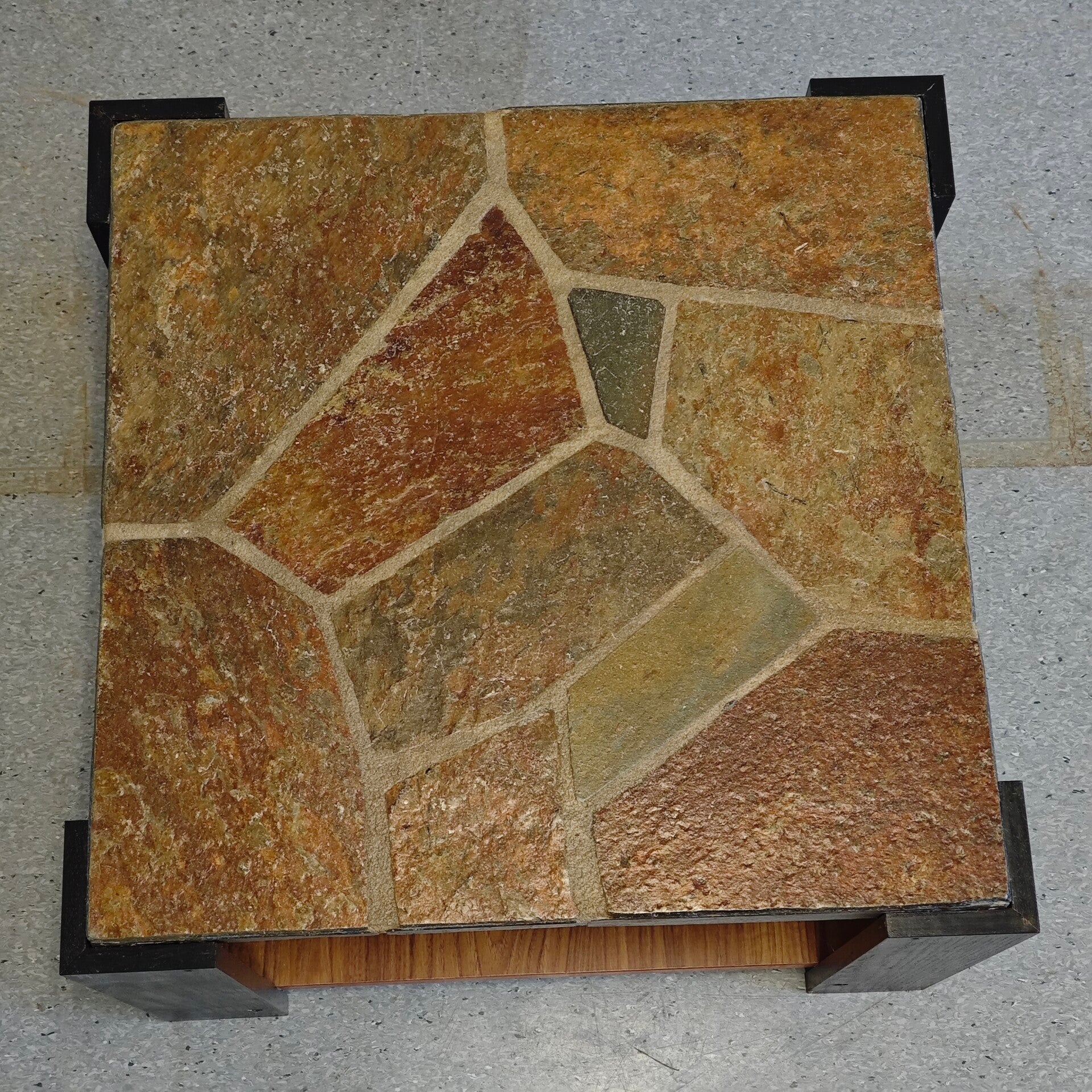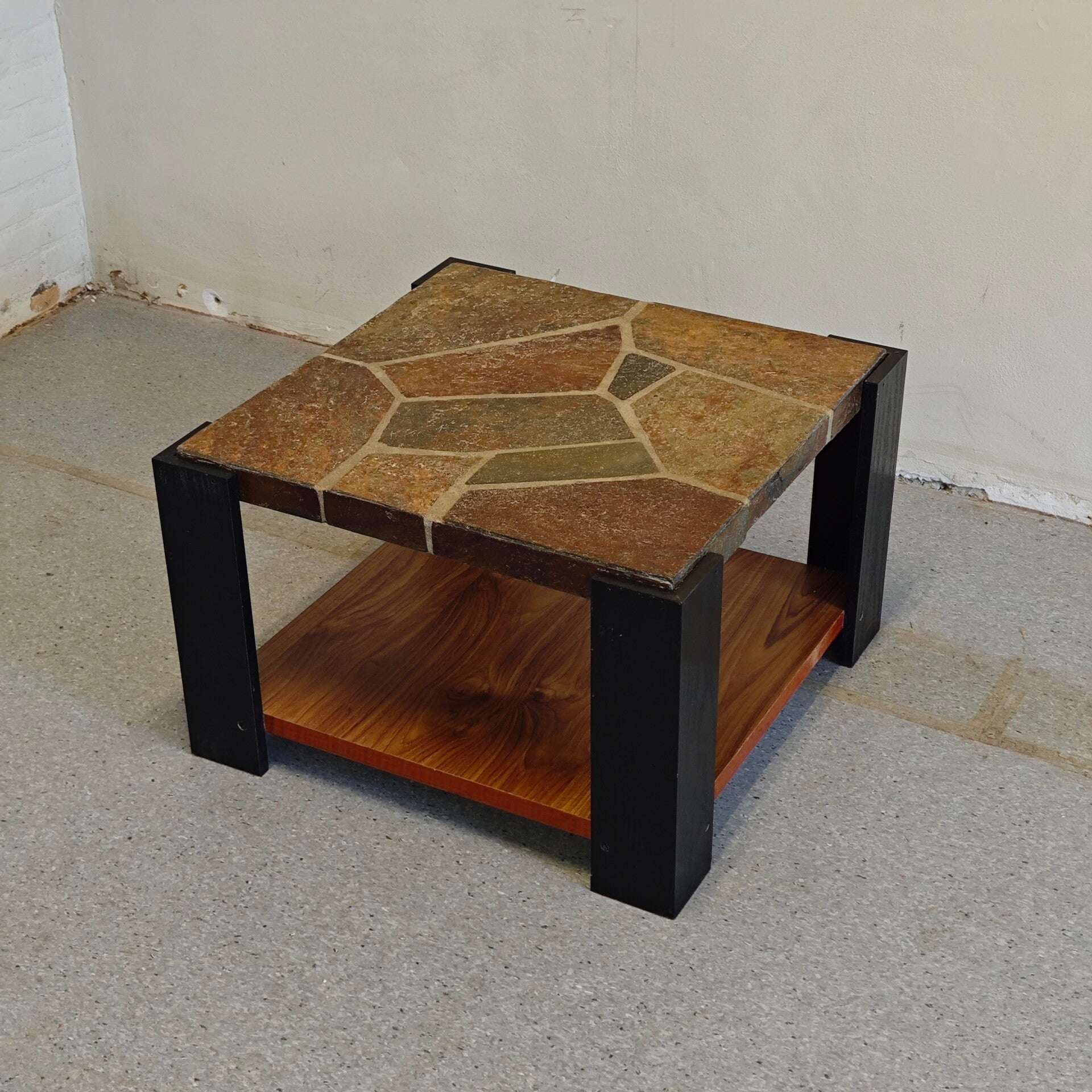 Deze bijzonder tafel is nog in erg goede vintage staat. Hier en daar zitten er wat gebruikssporen op het zwarte frame. Het leistenen blad is nog erg netjes en heeft een prachtig patroon. De houten plaat die onderin ligt ziet er ook nog keurig uit en maakt het een praktisch tafeltje!