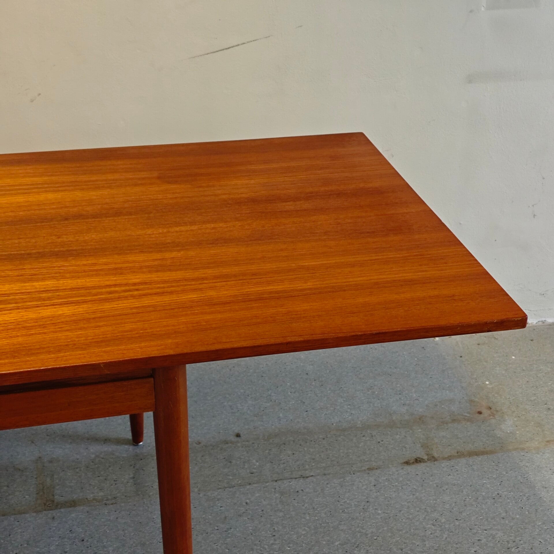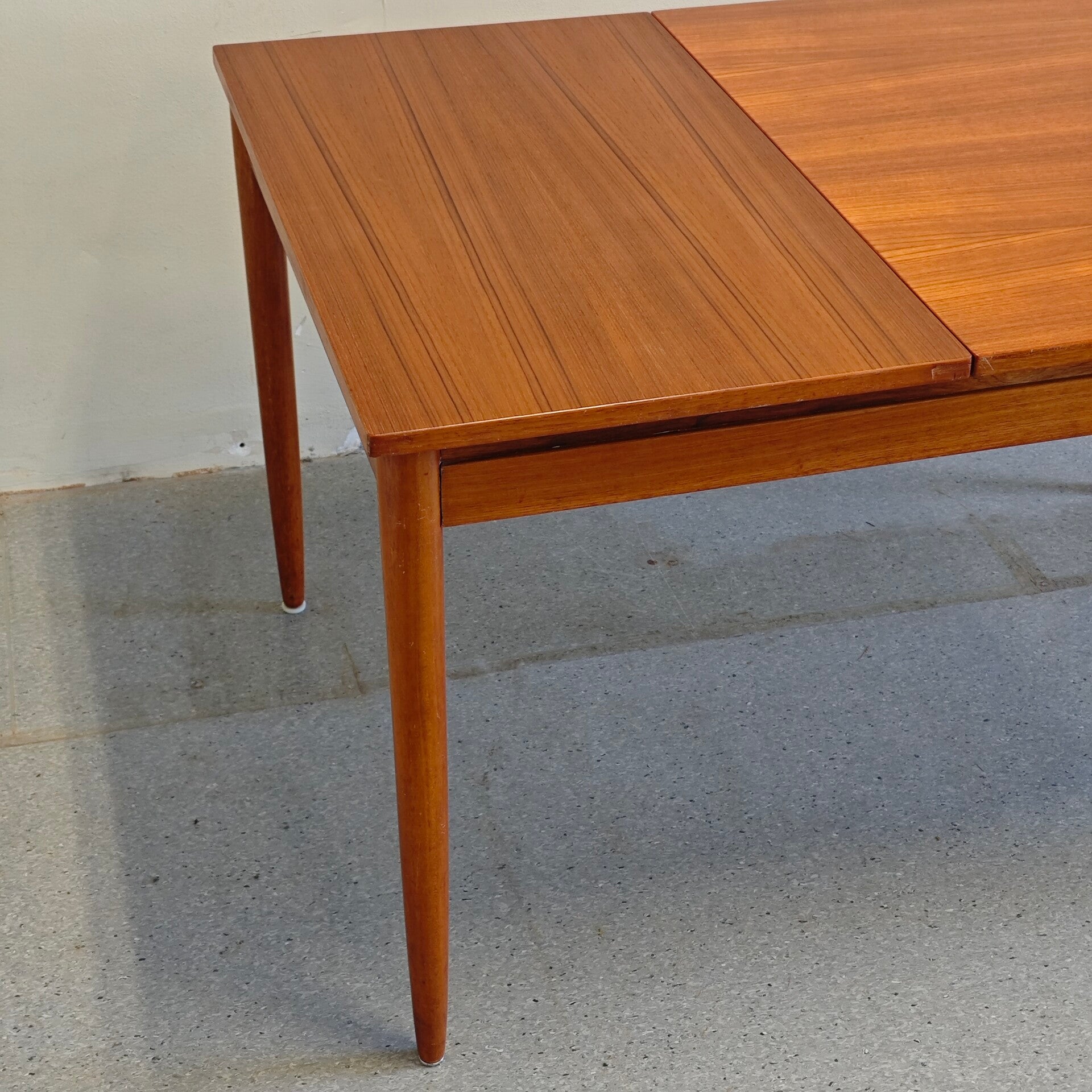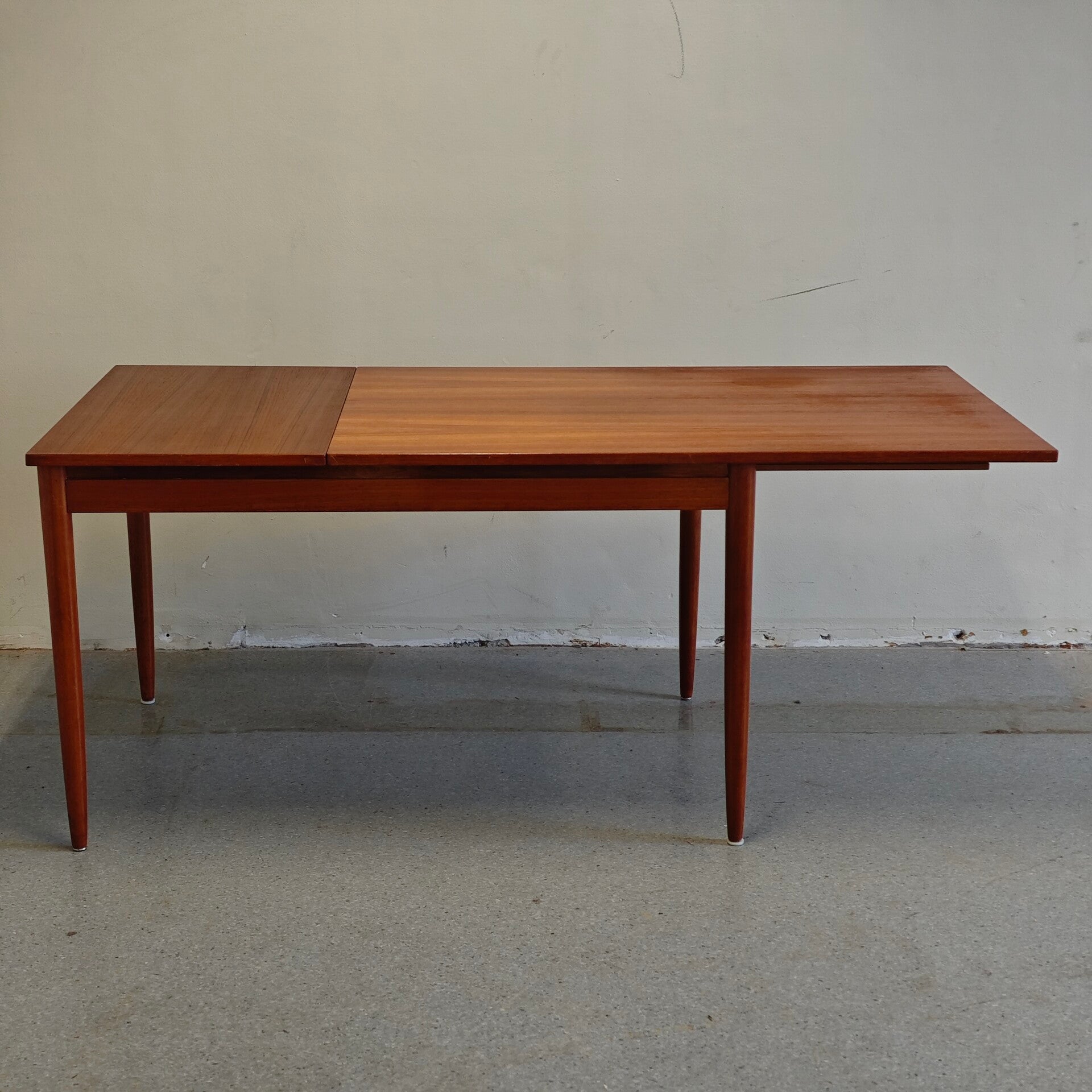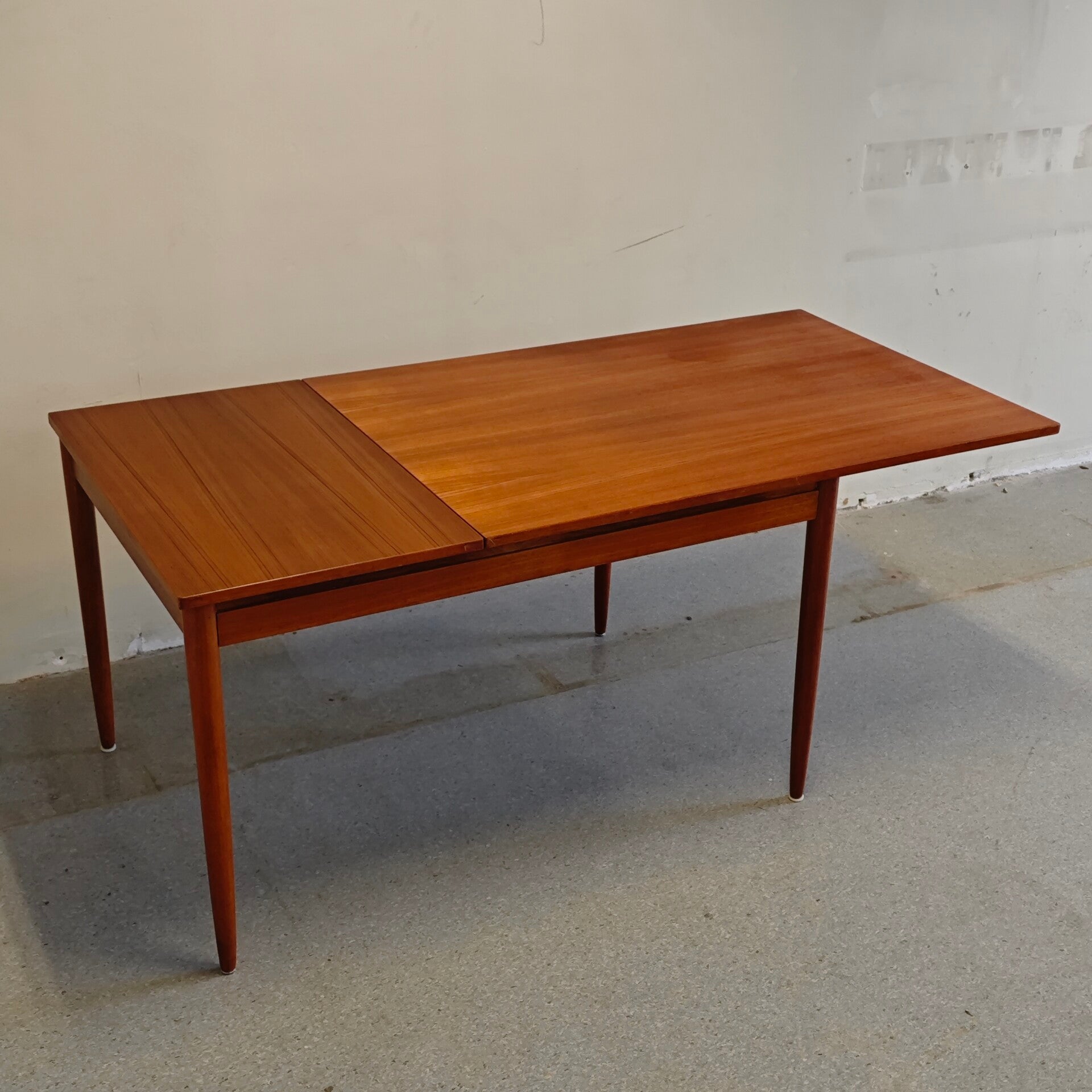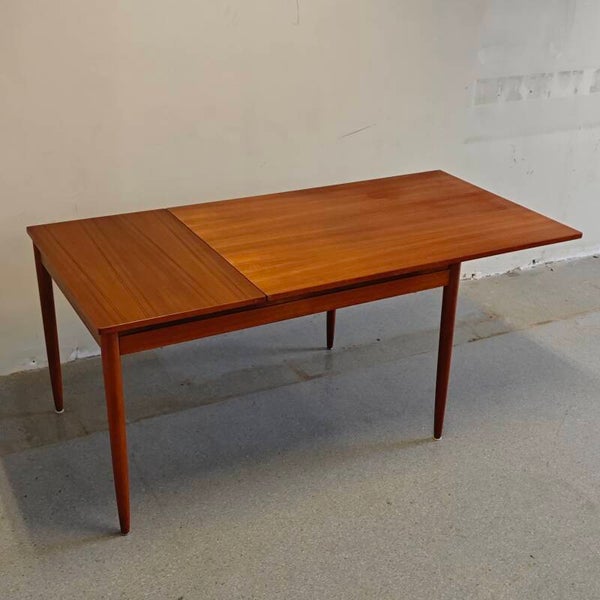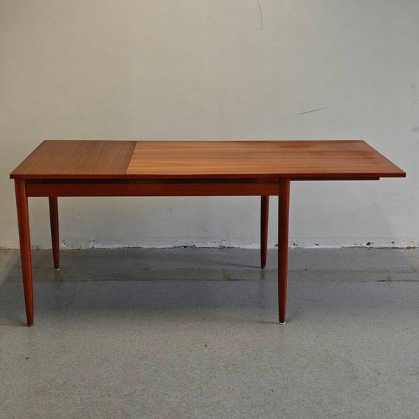 Deze prachtige tafel is nog in erg goede vintage staat. Zoals je op de foto's kan zien ziet er 1 kring in het blad. Verder is deze tafel vrijwel als nieuw! De grote blad kan opzij geschoven worden en kan er een klein blad ingevoegd worden. Een praktische en zeer mooie vintage eettafel!