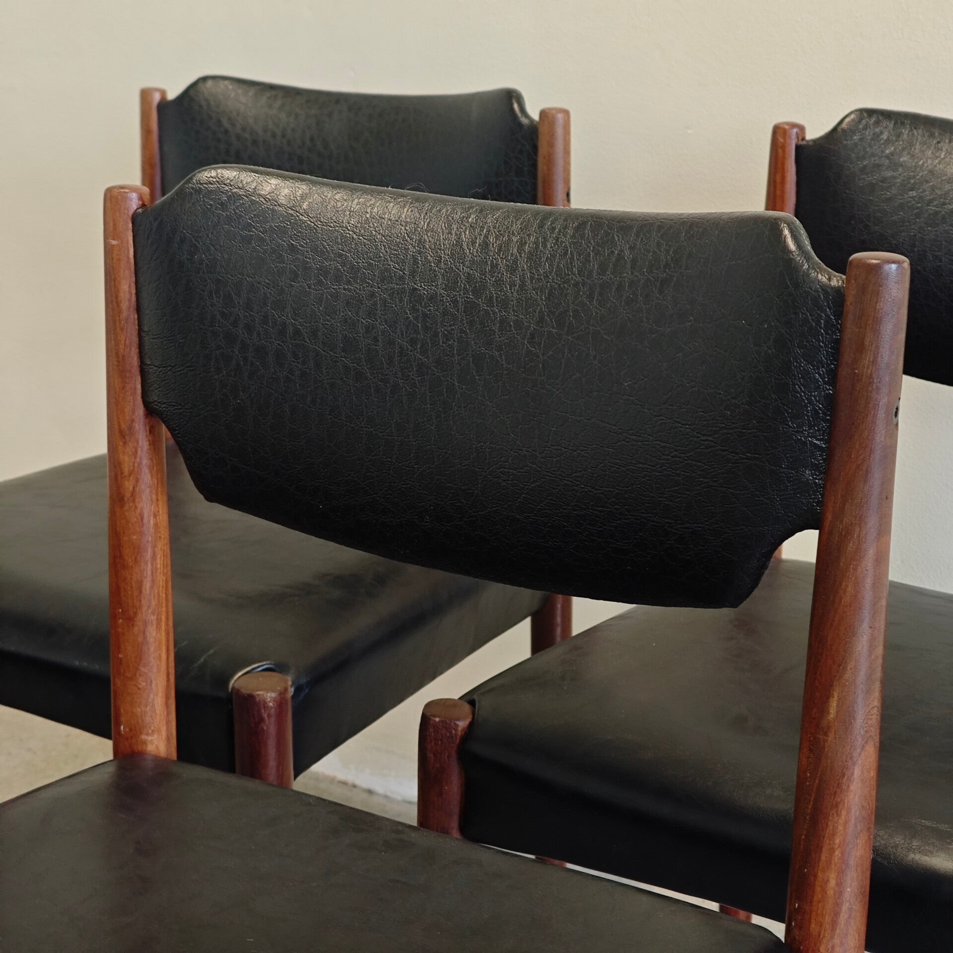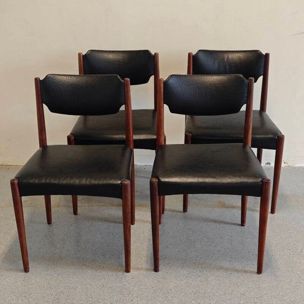 Deze mooie set stoelen is nog in goede vintage staat. De skai leer ziet er nog netjes uit en heeft alleen hier en daar wat gebruikssporen. De houten poten zijn nog netjes en zijn gemaakt van mooi teak hout. De poten kunnen makkelijk van de stoel gedemonteerd worden mocht dat nodig zijn. Een zeer net en mooi setje stoelen!
