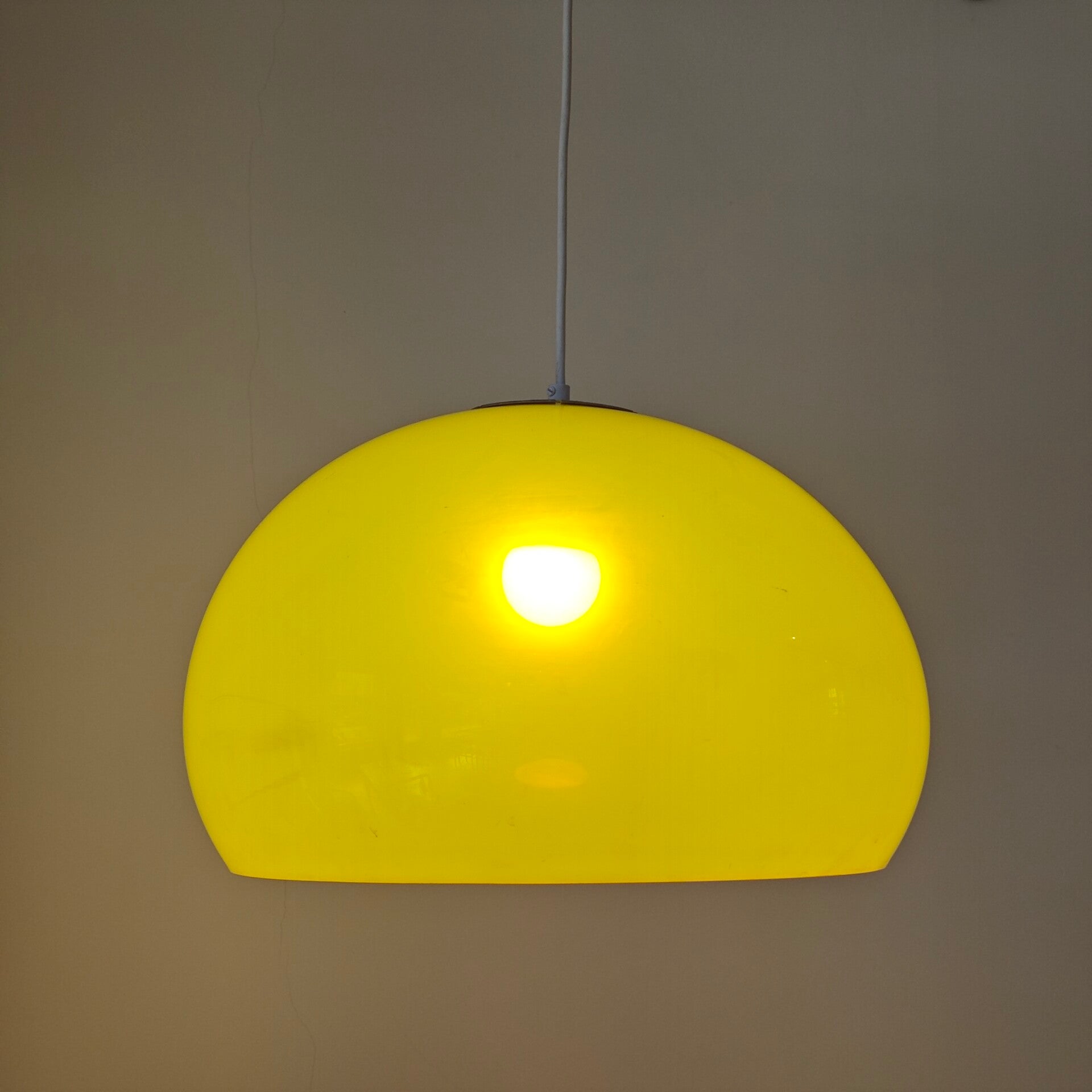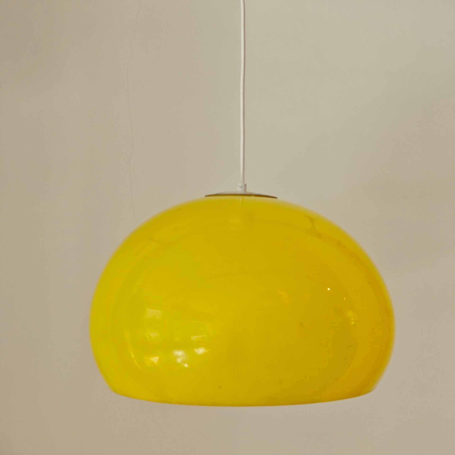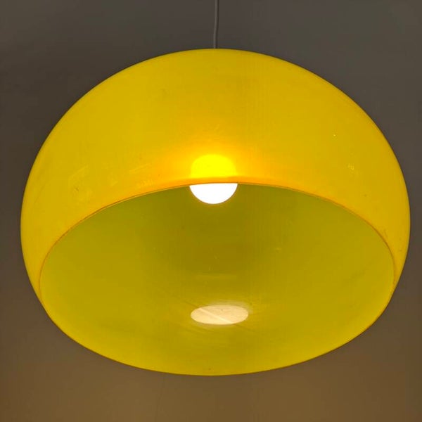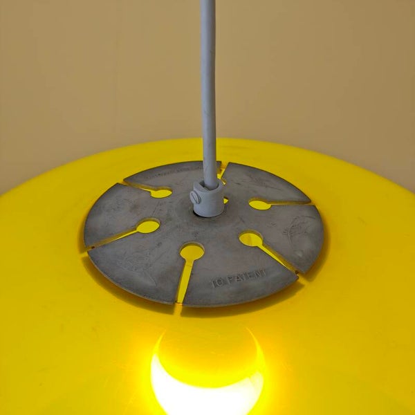 Deze leuke lamp is nog in goede vintage staat. De kap heeft wat krassen maar is verder nog erg leuk. De fitting en bedrading ontbrak dus die is er nieuw opgezet. Door het gele kunststof geeft deze lamp erg fijn en warm licht wanneer die aan staat!
